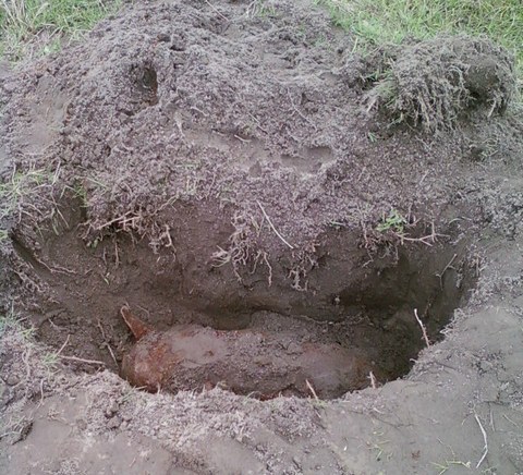 Стокилограммовая фугасная бомба залегала на полметровой глубине. Об обнаружении боеприпаса спасателям сообщил секретарь сельсовета, но кто его выкопал пока неизвестно.