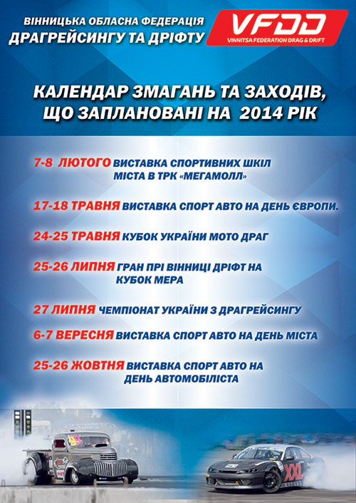 Главными событиями этого года для нас станут: 26 июля - Гран При Винницы по дрифтингу за кубок Владимира Борисовича Гройсмана и 27 июля - этап Чемпионата Украины по драгрейсингу с участием спортсменов из Европы.