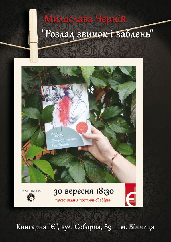 Книгарня «Є» і літературна агенція «Discursus» запрошують на презентацію збірки Милослави Черній «F 63.9. Розлад звичок і ваблень», яка відбудеться 30 вересня.