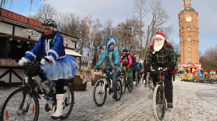 Біля сотні велосипедистів в яскравому новорічному вбранні проїхались по Європейській площі, до Центрального парку , а далі традиційно – вулицями міста.