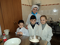 Майстер та викладач спеціальності «Кухар, пекар та кондитер» Лариса Гнатюк та учні училища влаштували майстер-клас з випікання млинців для дітей, розповідаючи секрети кулінарії.