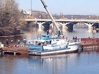 До конструкції фонтану підігнали баржу з підйомником, робітники перевіряють стан.