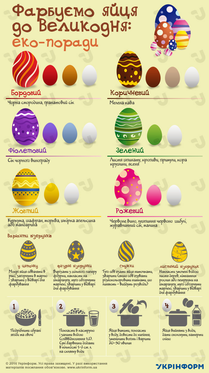 Відтак Укрінформ підготував інфографіку про основні натуральні барвники, які доцільно використовувати для фарбування великодніх яєць.
