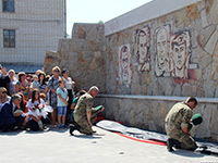 Під тугу мелодії «Плине кача» піднімається полотнище, яке закривало різьблені барельєфи 16-тьох героїв, увічнених в холодному камені. Всі присутні на мітингу схиляють голови та стають на одне коліно перед загиблими героями.