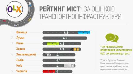 Вінниця, знаменита своїми швейцарськими трамваями, на думку українців, виявилася найбільш розвинутою з точки зору транспортної інфраструктури містом. Лідер набрав 4,6 бали з 7, трохи відстав Луцьк з оцінкою 4,5 бали. Третє місце поділили Харків і Рівне — по 4,3 бали. Більшість обласних центрів країни отримали близько 3,8-4 балів, внизу рейтингу опинився Ужгород з критичними 3,2 бали. Трохи випереджають його Чернівці з 3,4 бали.