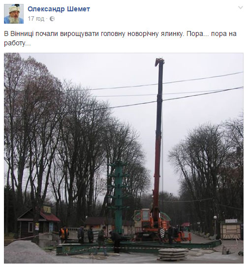 "В Вінниці почали вирощувати головну новорічну ялинку. Пора... пора на работу...", - пише на своїй сторінці у фейсбук Олександр Шемет, який в останні роки створює для вінничан новорічну казку в образі Діда Мороза.