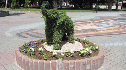 Директор турцентру Володимир Ходацький розповідає, що це “зелене слоненя” знайшли у Польщі, та привезли до Вінниці два тижні тому. Всередині металевого каркасу ростуть чотири туї, які не бояться холодів, а тому навіть взимку ця скульптура приваблюватиме погляди. "Її не треба додатково вкривати чи якось особливо оберігати, просто будемо поливати і все. Це вже не та черепашка з квітів біля парку, яку потрібно на зиму вкривати. У Польщі є проект, де слоненя тримає за хвіст маму, і ми поступово виходимо на майже той самий рівень".