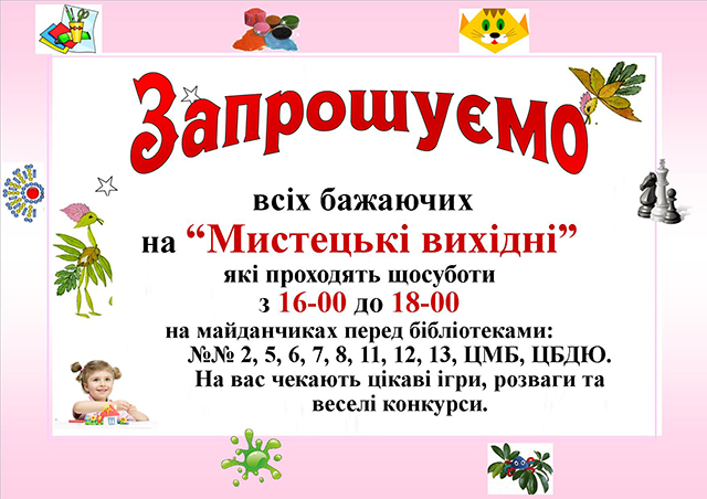 В цьому році проект «Мистецькі вихідні» проходитиме на майданчиках бібліотек-філій №2 (вул. Маяковського,122), №5 (вул. Д.Нечая,59), №6 (пров. Антонова, 50), №7 (вул. Баженова, 32). А також – у бібліотеках №8, що за адресою вул. Червоноармійська, 39, №11 (вул. Князів Коріатовичів,189), №12 (вул. Київська,126) та №13 (проспект Космонавтів,39). Крім того, Мистецькі вихідні проходитимуть у Центральній бібліотеці для дітей та юнацтва (проспект Космонавтів,63) та у Центральній міській бібліотеці (вул. Хмельницьке шосе,4). Заходи в рамках проекту біля бібліотек відбуватимуться по суботам з 16 години.