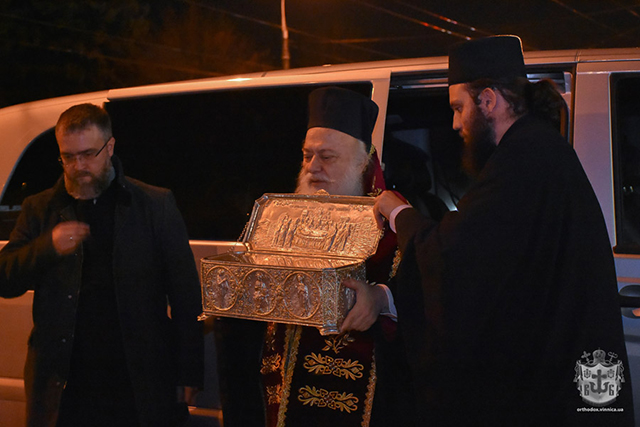 У Спасо-Преображенському кафедральному соборі мощі урочисто зустрів митрополит Симеон з духовенством міських храмів. Після того, як мощі були занесені до храму митрополит Симеон виголосив слово, у якому подякував владиці Пантелеімону за участь в урочистостях Вінницької єпархії та надану можливість молитовно вклонитись мощам святого Димитрія Солунського, а також попросив молитв за Україну, її народ та мир у державі.Після цього митрополит Пантелеімон звернувся до владики Симеона, духовенства та вірян з вітальним словом, у якому зазначив: «У ці дні ви будете мати посеред вас, серед цього храму, того, кого Православна Церква називає захисником Вселеної. Приходьте до нього, приносіть йому свою радість і горе, свої життєві проблеми та переживання і він швидко почує вас, і буде вашим особистим захисником».Після цього розпочався святковий молебень з акафістом великомученику Димитрію. По завершенні відправи сотні вірян молитовно вклонились святині.Довідка: