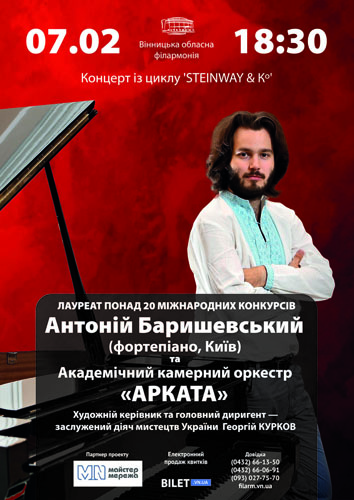 Цикл фортепіанних вечорів 'Steinway & K', на сцені філармонії один із кращих та найяскравіших молодих українських піаністів Антоній Баришевський (Київ). Традиційно перший відділ присвячено сольному музикуванню нашого гостя, а у другій половині вечора Антоній та Академічний камерний оркестр “Арката” виконають Перший концерт для фортепіано, труби і струнного оркестру Дмитра Шостаковича. Партію труби виконає артист симфонічного оркестру, керівник філармонійного біг-бенду Борис Ісаков.