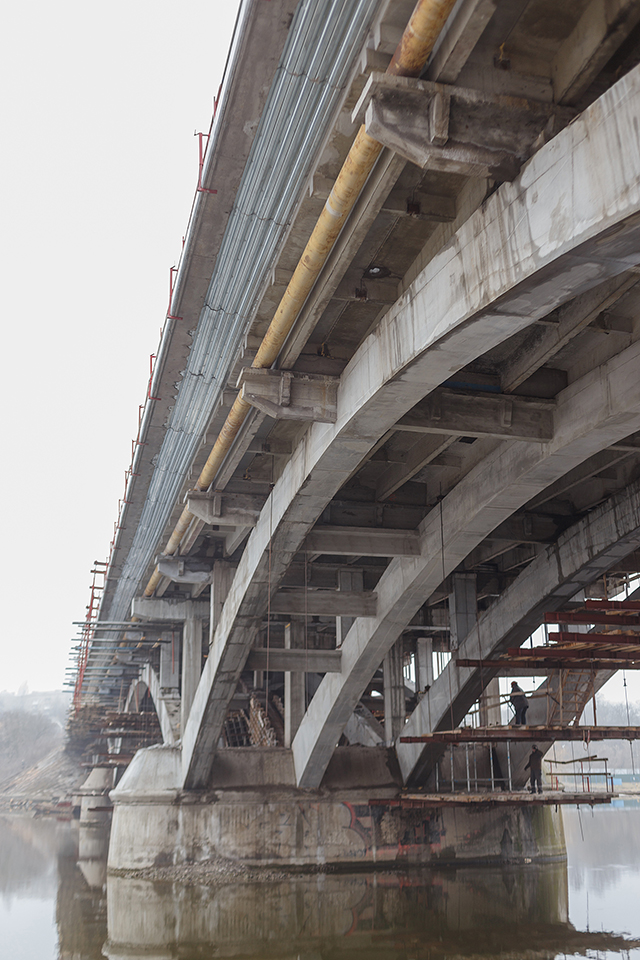 Масштабну реконструкцію мосту по вулиці Чорновола у Вінниці розпочали в березні минулого року. За проектом вона має тривати два роки. Протягом 2017-го року на мосту влаштовані підпірні стіни та перехідні плити на під’їздах мостової споруди, винесено газопровід, виконано підсилення 50% арок та надарочних стійок. Підсилили усі колони та ригелі мосту. Замінили два крайніх ряди мостових балок тощо.Ремонтники працюють із випередженням графіку, але дотримуються усіх відповідних технологій. З початку цього року уже виконано підсилення (тобто армування та бетонування) ще трьох арок, четверту заармовано і встановлено опалубку для оббетонування. Взимку також було виконано підсилення чотирьох надарочних стійок. Завершено розширення пішохідного тротуару в двох прольотах мостової споруди. Завершується монтаж опалубки для розширення пішохідного тротуару в 3-му та 4-му прольотах та закінчується армування 5-ї арки мостової споруди. Загалом роботи виконані уже на 70%. Наразі на будівельному майданчику працює понад 50 чоловік.«До повного завершення реконструкції мосту необхідно виконати підсилення п’яти арок з 16 та 12 надарочних стійок, завершити «лікування» ригелів в прольотах мостової споруди. З іншої сторони мосту уже почали демонтувати тротуар, демонтуємо старі балки та встановлюємо нові. Після цього будемо виконувати ремонт дорожньої полоси – робимо армування і бетонуємо. Плануємо цього року міст повністю зробити і здати в експлуатацію», - розповів директор департаменту капітального будівництва міської ради Ігор Кравець.