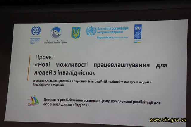 Проект представляли директор Департаменту соціальної та молодіжної політики ОДА Наталя Заболотна та директор центру комплексної реабілітації для осіб з інвалідністю «Поділля» Роман Штогрин. Проект «Нові можливості працевлаштування для людей з інвалідністю» розроблений фахівцями Центру «Поділля» реалізується в межах спільної Програми ПРООН, ВООЗ, та МОП «Сприяння інтеграційній політиці та послугам для людей з інвалідністю в Україні» і передбачає відпрацювання моделі надання послуги соціального супроводу людей з інвалідністю на робочому місці з метою збільшення кількості зайнятих людей з різними формами інвалідності на відкритому ринку праці.Запровадження даної соціальної послуги матиме значний вплив на зайнятість людей з інвалідністю. Держава візьме на себе роль посередника у вирішенні проблем, які можуть виникати між робогодавцями і людьми з інвалідністю. Ринок праці, таким чином, ставатиме більш доступним для них.