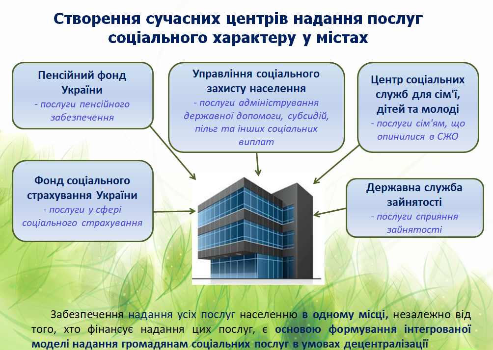 Урядова реформа децентралізації вирішує цю проблему: 665 утворених територіальних громад (ОТГ) вже взяли на себе нові повноваження, у тому числі з питань соціальної політики. Зараз уряд допомагає ОТГ створювати сучасні центри надання соціальних послуг у форматі «Прозорий офіс». У минулому році з державного бюджету було виділено 52,4 млн грн. місцевим бюджетам міст Кам’янське, Київ, Львів, Одеса та Харків на створення таких центрів. Цього року бюджетні кошти на ці цілі отримають 8 міст обласного значення (Бахмут, Дружківка, Кам’янське, Кропивницький, Мирноград, Новоград-Волинський, Рубіжне, Чернігів) та 8 об’єднаних територіальних громада (Мереф’янській міській, Радивилівський міській, Гніздичівській селищній, Мельниця-Подільській селищній, Скала-Подільській селищній, Байківецькій сільській, Великодедеркальській сільській, Студенянській сільській). Загальна сума бюджетної підтримки сягне 142,7 млн грн.