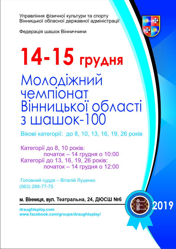 14–15 грудня 2019 року у Вінниці (міська ДЮСШ №6, вул. Театральна, 24) відбувся молодіжний чемпіонат Вінницької області з шашок-100.
