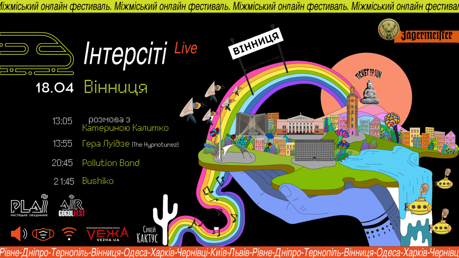 Цієї суботи, 18 квітня, Вінниця долучиться до першого в Україні онлайн-фестивалю “Інтерсіті Live – Міжміське культурне сполучення”. На ньому виступлять Катерина Калитко, Гера Луідзе, Гудімов, Brat, Sasha Boole, Tik Tu, Ofliyan та багато інших артистів з 9 міст України.