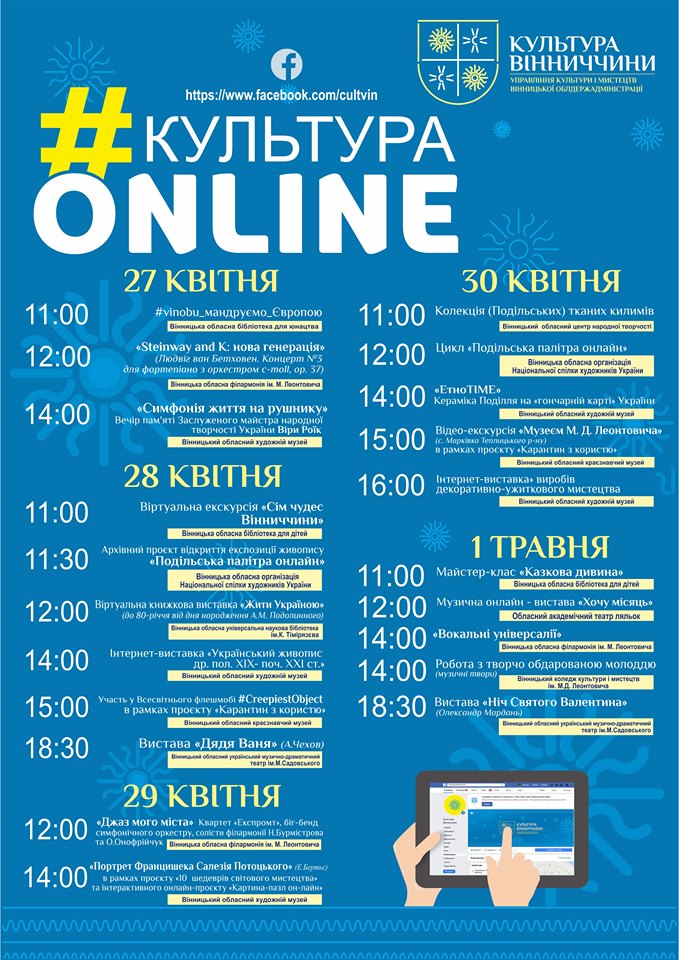 Проєкт «Культура онлайн» пропонує афішу на тиждень, з 27 квітня по 1 травня.