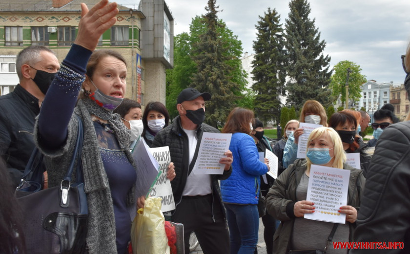 До стін мерії вінничани прийшли з плакатами «Кабінет Міністрів, почуйте нас. Ми підприємці малого бізнесу, платимо усі податки. У нас всі гроші залишилися в товарах. Нашим дітям також потрібно їсти», «Відкрийте непродовольчі ринки», «Кабмін, поживи два місяці без зарплати», «Чим годувати сім’ї?».