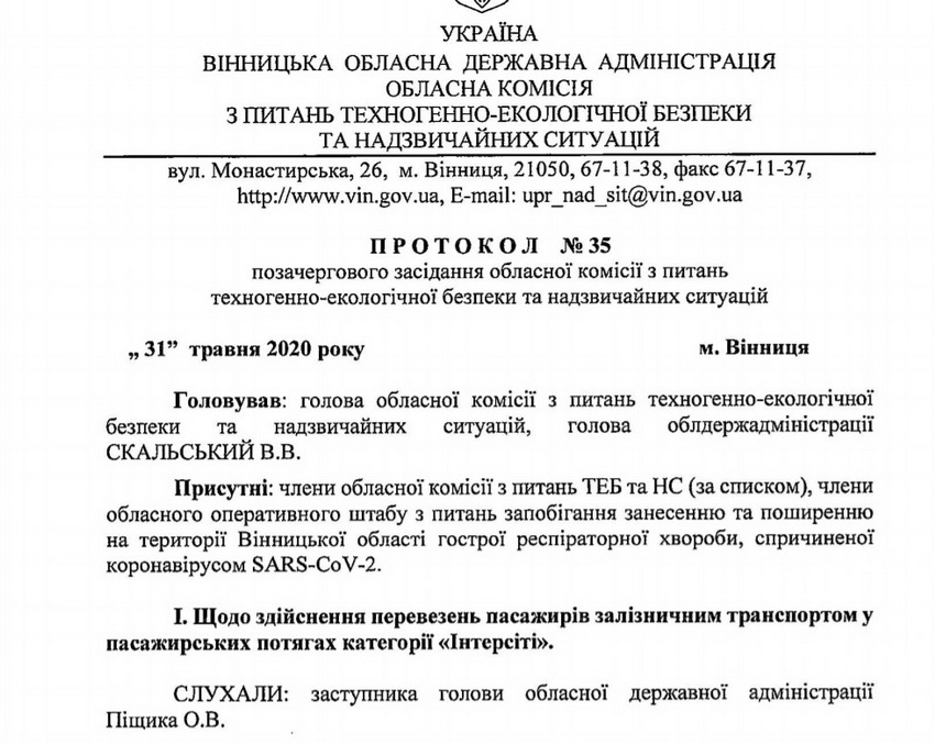 Комісія з питань техногенно-екологічної безпеки та надзвичайних ситуацій Вінницької ОДА 31 травня прийняла рішення, яким дозволила здійснення пасажирських перевезень залізничним транспортом у поїздах категорії «Інтерсіті» з 1 червня.
